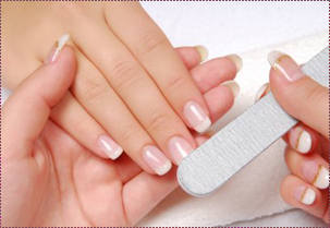 Involves soaking the hands, pushing cuticle back, filing and shaping the nails, applying lotion and massage, nail polish and finish.